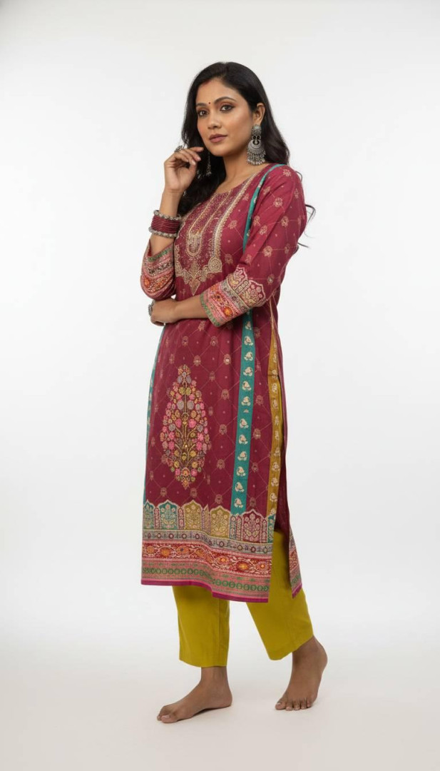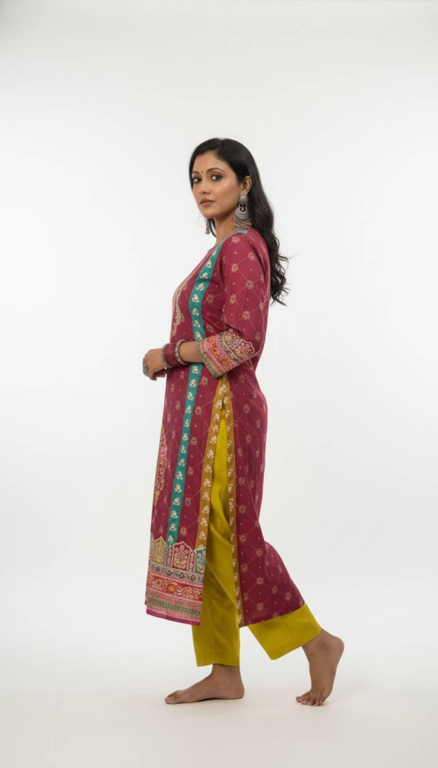 Elegant 3-piece ethnic set featuring a stylish top, matching pants, and a beautifully detailed dupatta.