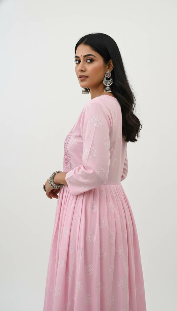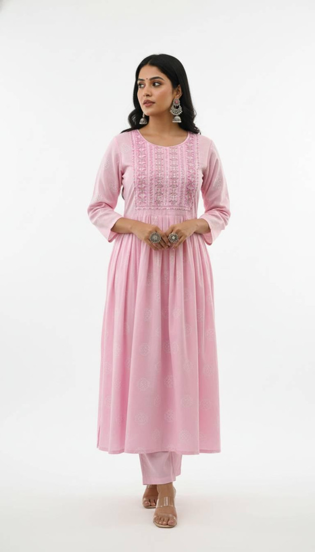 Beauiful umbrella-style rayon kurti with elegant embroidery on the front panel.