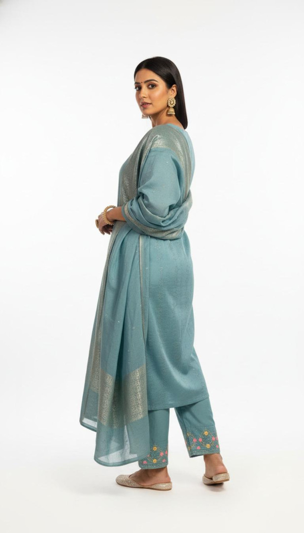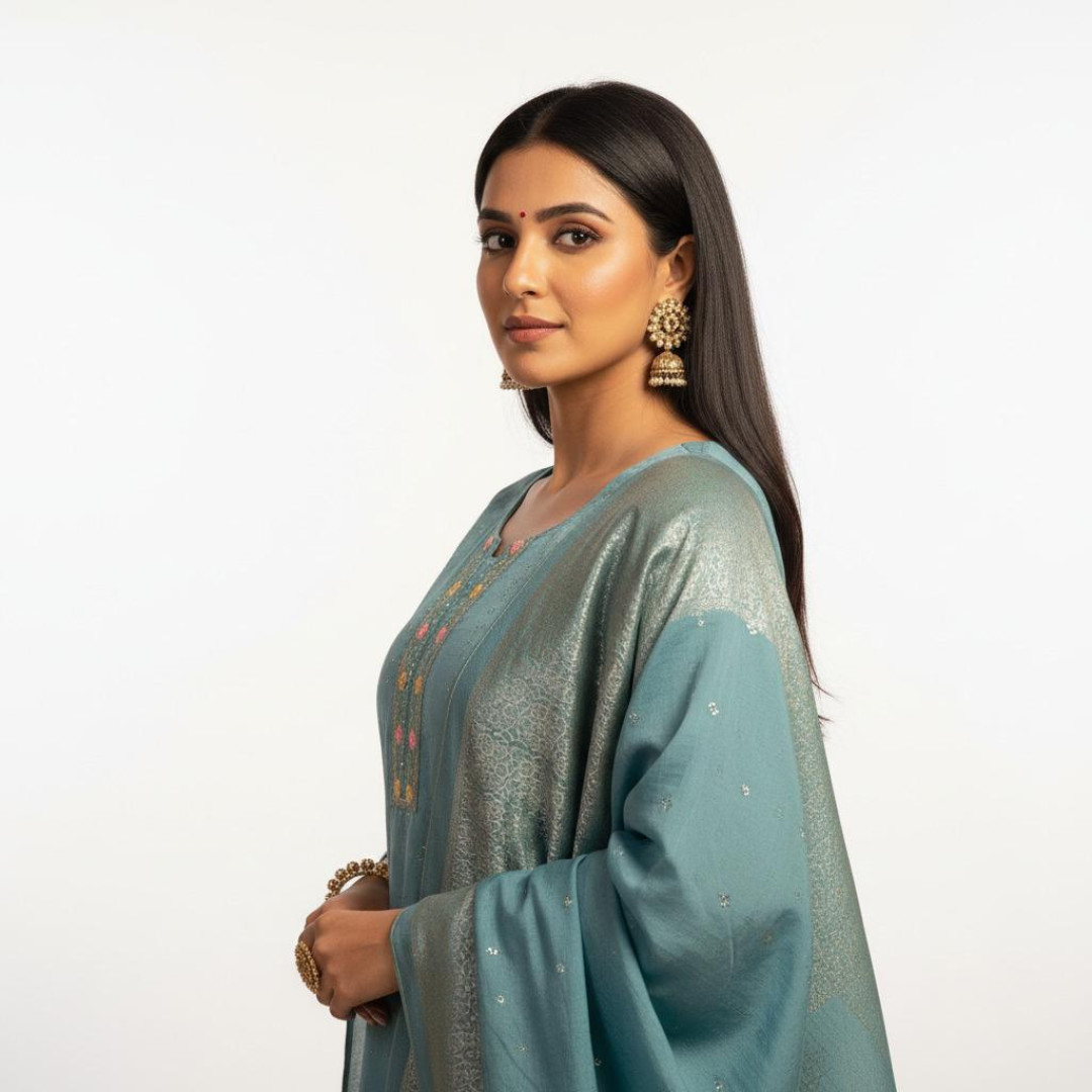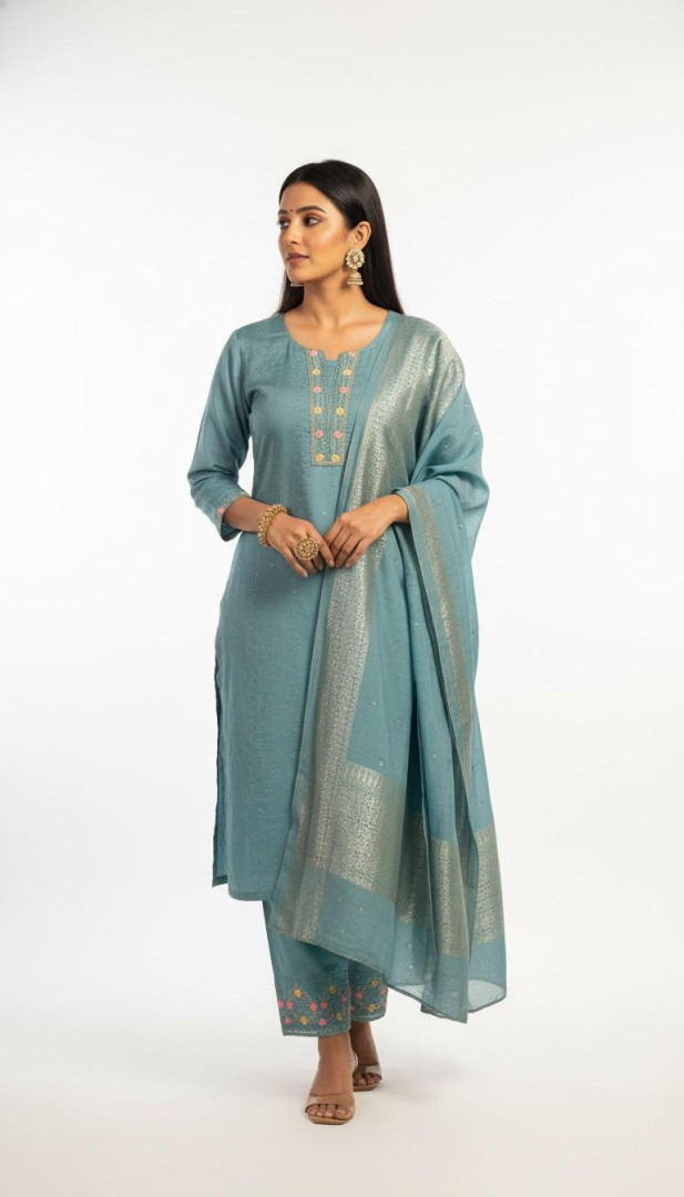 Premium silk suit set featuring a beautifully embroidered kurti, matching pant, and a rich woven dupatta.