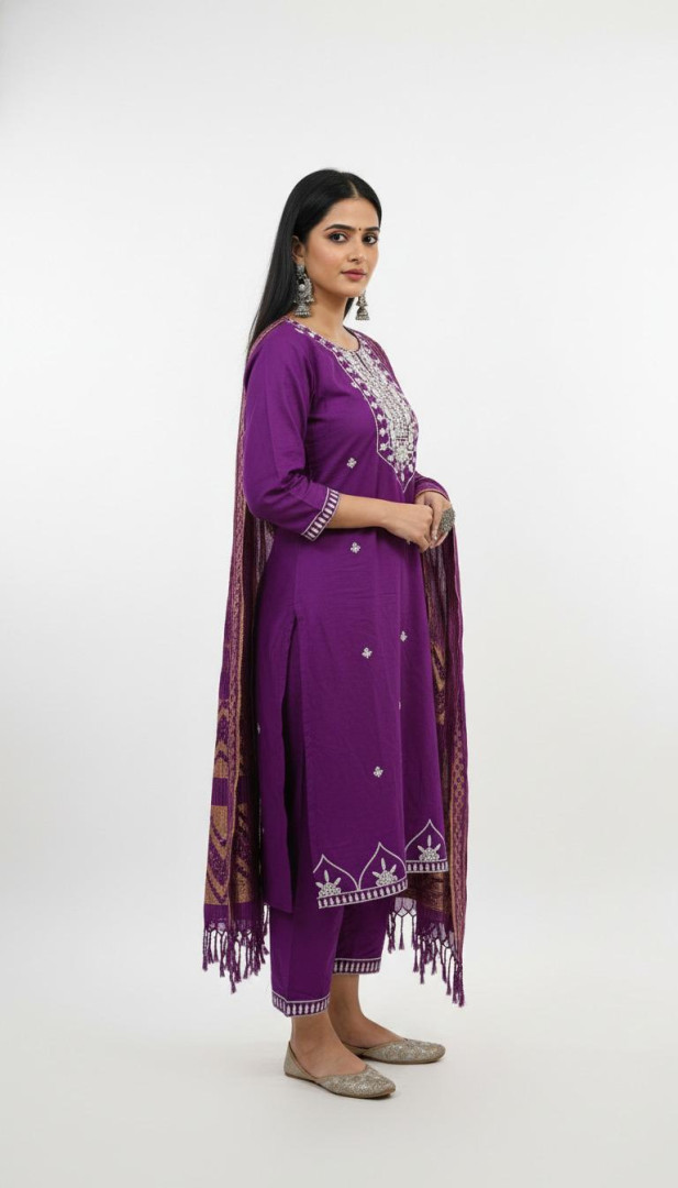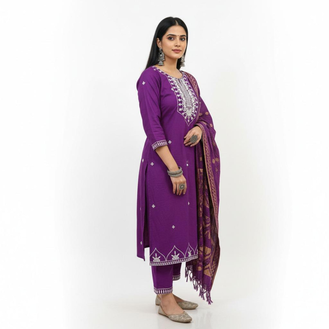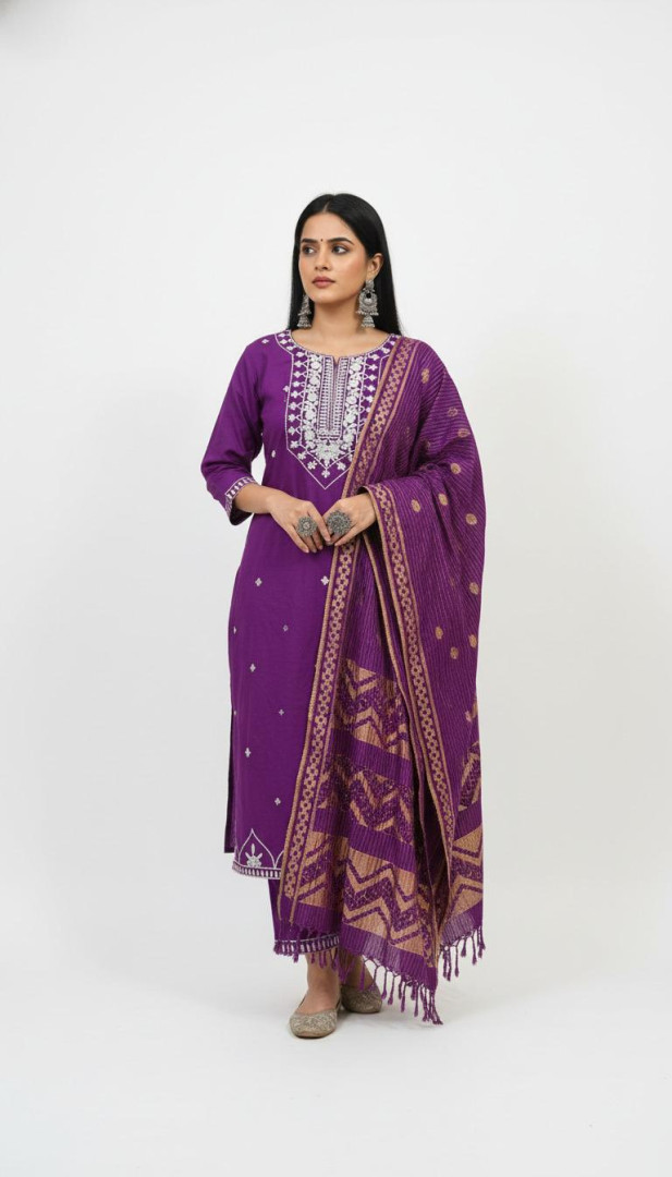 Stylish rayon set designed with beautiful Wild Rose embroidery.